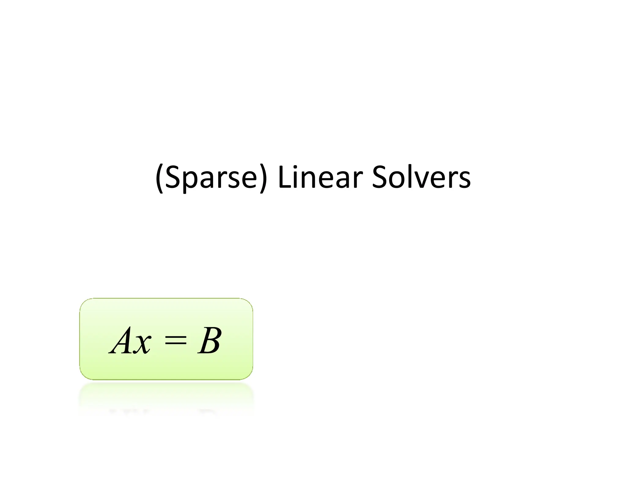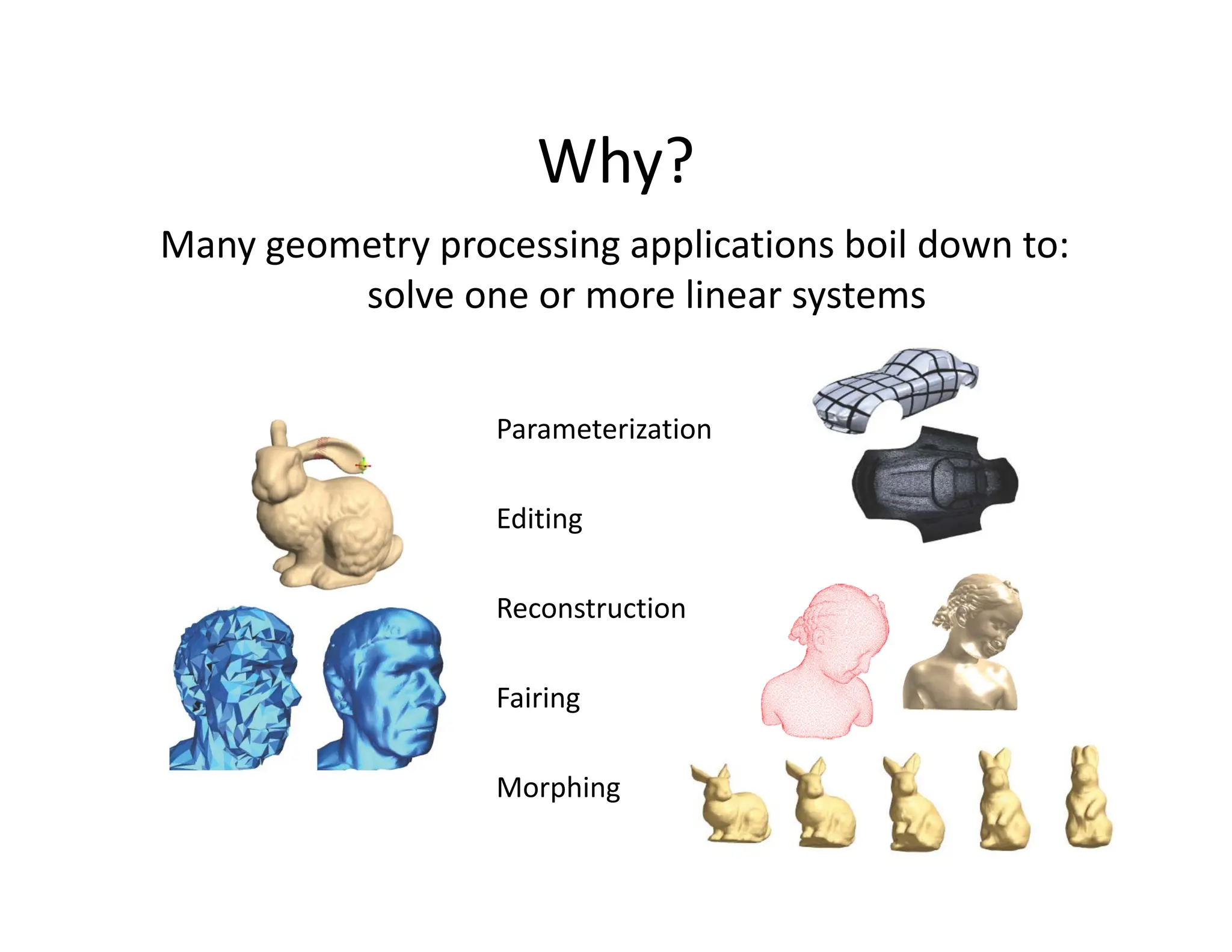 The document discusses various linear solvers useful for geometry processing applications, emphasizing the importance of solving linear systems defined by sparse matrices. It explains different types of solvers, including iterative and direct methods, outlining their respective advantages and disadvantages. The conclusions highlight that sparse solvers are often the best choice for sparse symmetric positive definite systems generated by geometry processing algorithms.