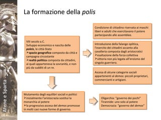 Il documento esplora la formazione delle poleis nell'VIII secolo a.C., evidenziando il mutamento politico da monarchia ad aristocrazia e, in alcuni casi, a democrazia. Viene confrontata Atene e Sparta, due potenze dell'epoca, descrivendo le loro strutture politiche, sociali e militari, inclusa l'educazione spartana e la costituzione ateniese. Si analizzano anche i passaggi significativi come le riforme di Solone e Clistene che contribuirono alla democratizzazione e all'espansione dei diritti cittadini.