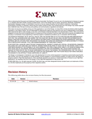 The document provides a user guide for the Spartan-3E Starter Kit Board, covering its key components and features. The board includes switches, buttons, LEDs, and multiple clock sources. It is intended for learning Xilinx FPGA and software basics as well as for more advanced development. The guide describes the purpose and operation of each component and how to interface with them in a design.