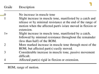 - Characteristics including increased resistance to passive movement and hyperactive stretch reflexes.