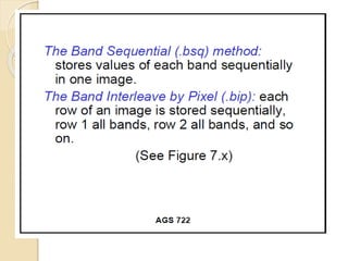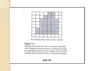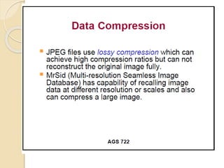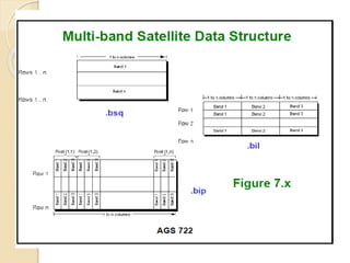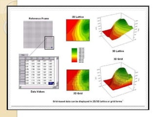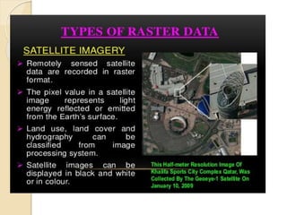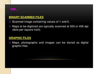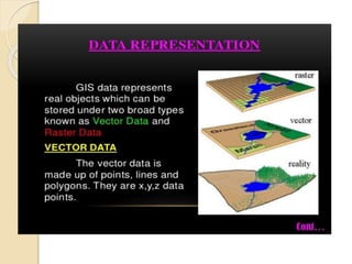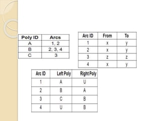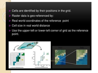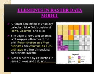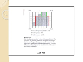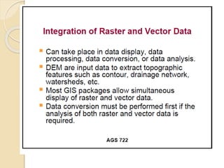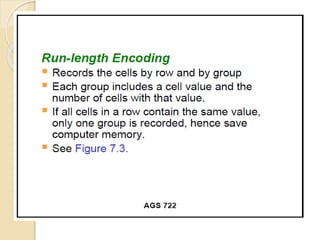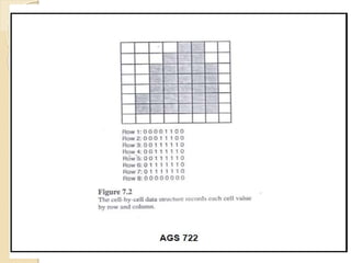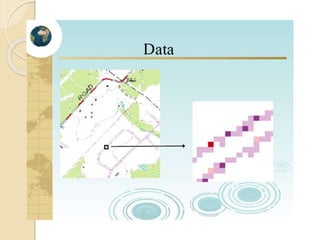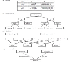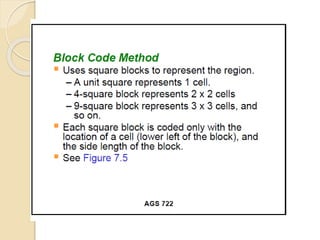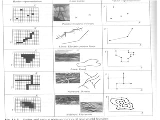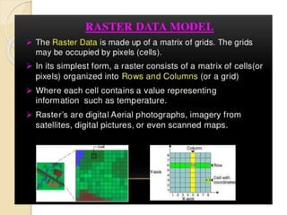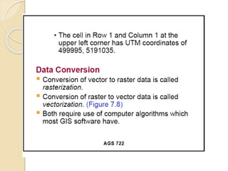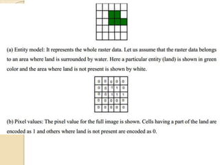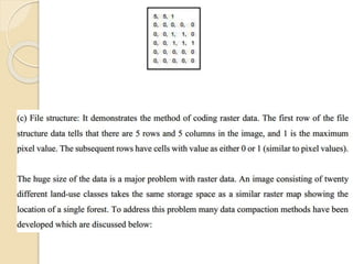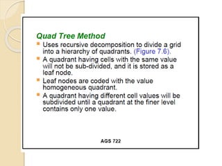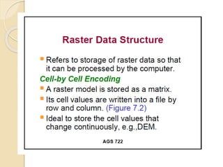 The document discusses various spatial data models, focusing on database structures used in Geographic Information Systems (GIS), including relational and object-oriented databases. It covers key concepts like normalization, entity-relationship models, and vector and raster data structures, emphasizing the roles of feature classes, relationships, and data compression techniques. The document illustrates how these models facilitate effective data management and spatial analysis in GIS applications.