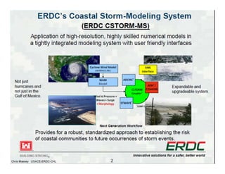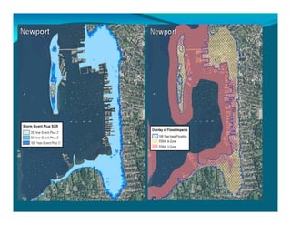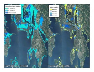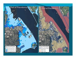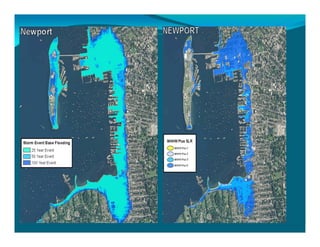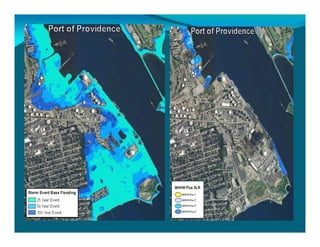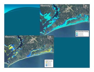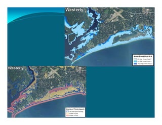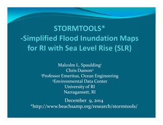 The document outlines the vision and tools under development for StormTools, a system designed to provide coastal planning tools accessible via a web service for predicting flooding due to sea level rise (SLR) in Rhode Island. It details the use of high-resolution storm inundation models and extremal analysis to prepare flood maps for different return periods and SLR scenarios. The project also includes plans for a simplified flood mapping strategy and web-based mapping viewer access for public use.