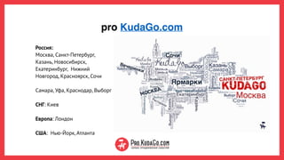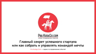 Документ описывает сервис pro.kudago.com, предназначенный для продвижения событий в России и за рубежом с высокой посещаемостью и активной работой в социальных сетях. Упоминаются сильные стороны стартапа, такие как гибкость, работа с командой и важность навыков для успеха, включая презентацию и умение выходить за пределы зоны комфорта. Также сделан акцент на важности поиска качественных инвестиций и построения команды мечты.