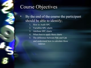 This document provides an overview of statistical process control (SPC). It discusses the objectives of an SPC course, which are to learn how to audit SPC and understand variables and attributes control charts. It then defines SPC and the types of variation it can detect. The document outlines the different types of SPC charts, including variables charts (x-bar and R, x-bar and s), attributes charts (p, np, c, u), and when each is best applied. It also discusses process capability studies and calculating Ppk and Cpk values.