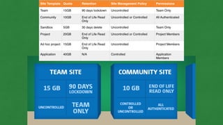 This document provides an overview of key concepts for becoming a master power user of SharePoint and Office 365. It discusses topics such as sites, site collections, lists, libraries, columns, content types, security, search and display, PowerApps and Flow, and Power BI dashboards. The document emphasizes understanding when and how to properly use different SharePoint features and recommends ways to optimize performance and governance.