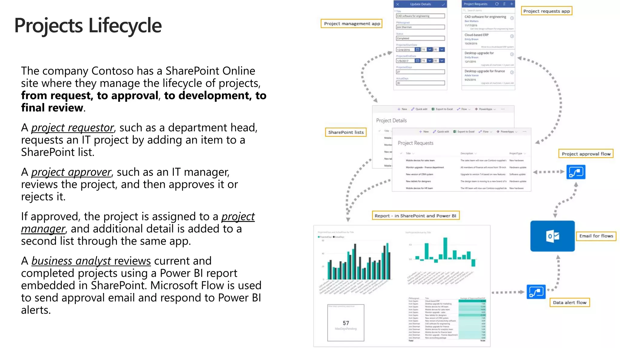 The document discusses the Microsoft Power Platform, emphasizing its ability to empower users to enhance business processes through applications like PowerApps, Power BI, and Microsoft Flow. It outlines the integration benefits with SharePoint for managing projects, customizing forms, and using SharePoint as a data source. Resources for further learning about the platform and its capabilities are also provided.