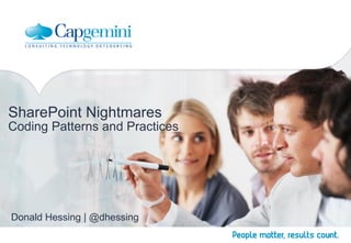 Donald Hessing presented on SharePoint coding patterns and practices. He discussed various anti-patterns to avoid such as directly accessing the SPList[] array and SPList.Items collection. He also covered the service locator pattern and how it can reduce tight coupling. Finally, he demonstrated how to properly dispose of objects in PowerShell scripts using Start-SPAssignment and Stop-SPAssignment.