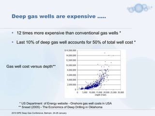 This document summarizes a presentation on the use of formate brines for deep gas field development projects. It finds that formate brines provide operational efficiencies over conventional drilling fluids by providing a more stable wellbore, faster tripping speeds, and fewer well control incidents. These efficiencies can reduce well construction costs and times. The document also finds that fields developed using only formate brines were able to recover 90% of reserves within 7-8 years, indicating formate brines may enable more efficient production.
