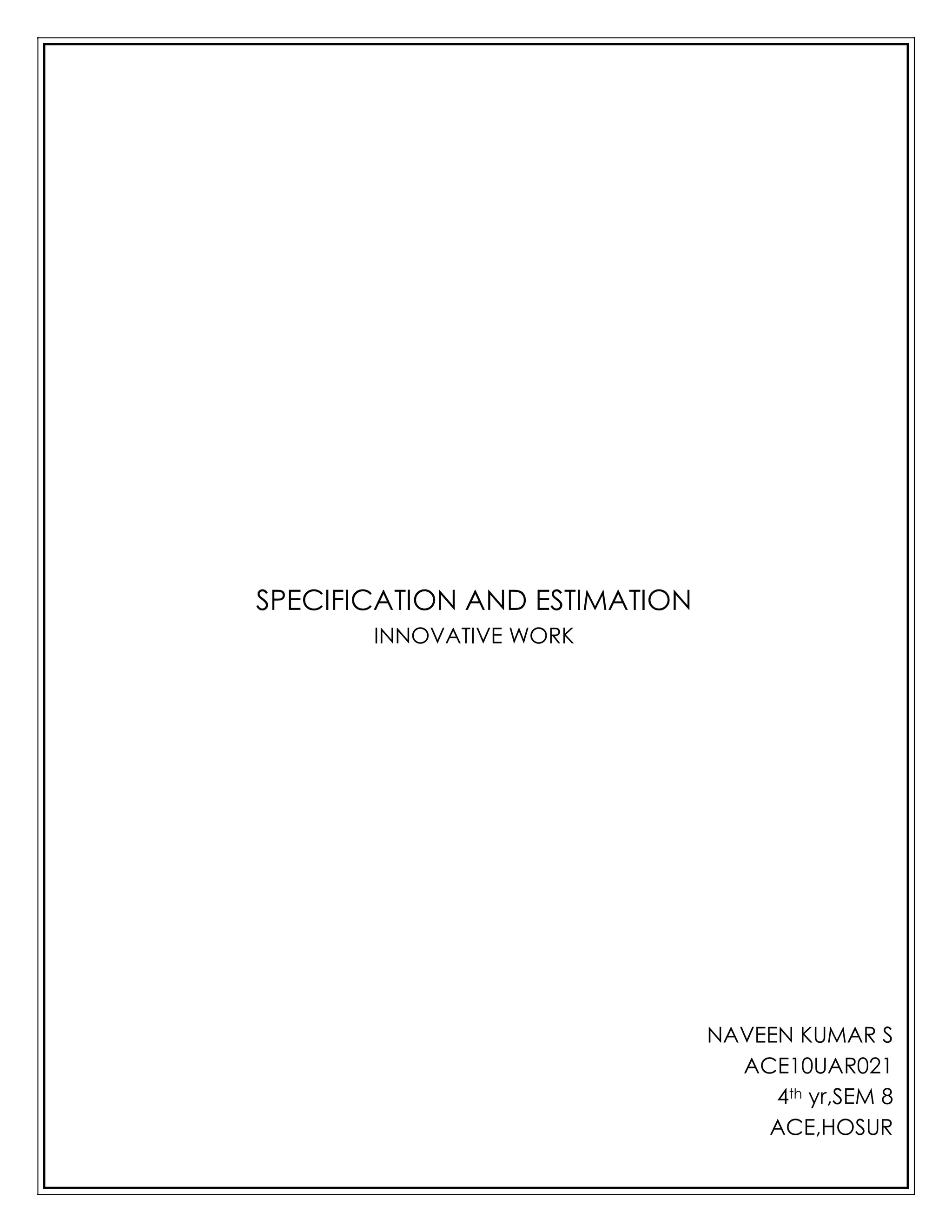 This document discusses various methods of construction cost estimation, including preliminary estimates, plinth area method, cubical contents method, unit base method, abstract estimates, detailed estimates, bottom up method, and square foot estimates. It also discusses factors that influence specification, rate analysis, and final estimates. Preliminary estimates provide early project costs but have low accuracy of 20-30%. Detailed estimates use quantities, rates, and specifications to determine costs more accurately. The bottom up method aggregates task estimates to determine total project costs.