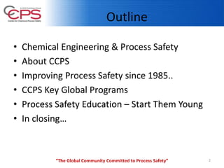 The document provides an outline and overview of the Center for Chemical Process Safety (CCPS) and its efforts to improve global process safety. The summary is: