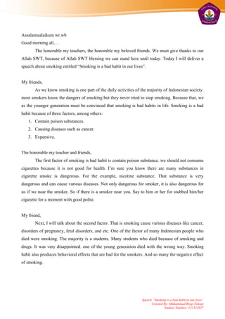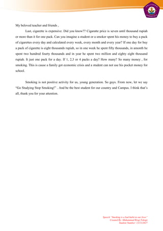 Pidato menjelaskan bahwa merokok adalah kebiasaan buruk karena mengandung zat berbahaya, menyebabkan penyakit seperti kanker, dan mahal. Pidato mendorong generasi muda untuk meninggalkan kebiasaan merokok dan fokus pada pendidikan.