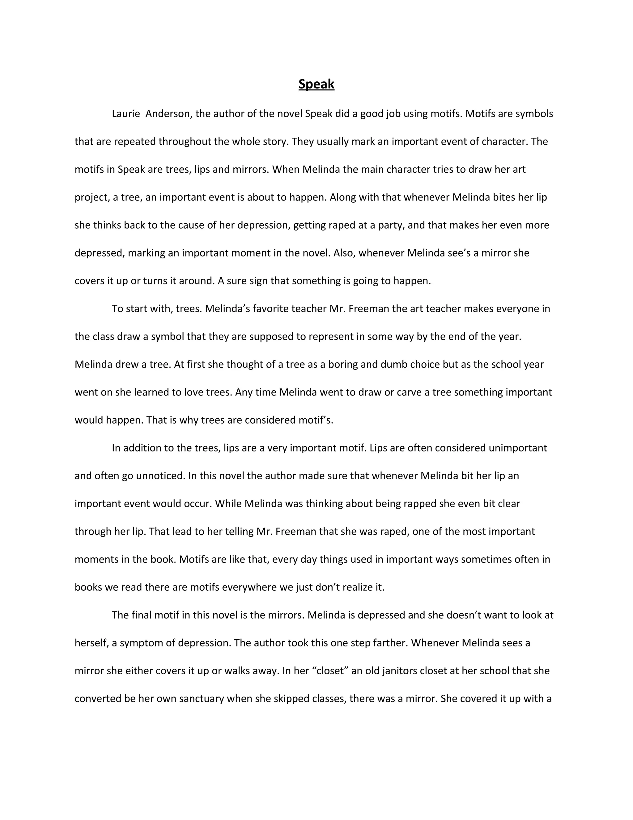 The document discusses the use of motifs in the novel "Speak" by Laurie Anderson. It identifies three motifs used in the novel - trees, lips, and mirrors. [1] Trees represent important events in the story, especially related to Melinda's art projects. [2] Lips signify moments when Melinda thinks back to being raped, worsening her depression. [3] Mirrors indicate that something impactful is about to happen, as Melinda avoids looking at her reflection due to her depression. The author effectively uses these everyday objects as motifs to mark meaningful points and deepen the story.