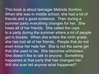 This document discusses resources for teaching the book "Speak" by Laurie Halse Anderson in a classroom. It includes summaries of the book's plot, plans for student activities like a web quest on sexual assault and poems relating to themes in the book. A depression video and information sheet on date rape are also mentioned as resources to teach themes of depression and assault presented in the novel. The document evaluates that while the web quest is aimed at 7th graders, the book would be more appropriate to teach to 8th graders due to its mature subject matter.