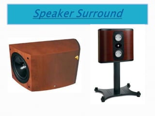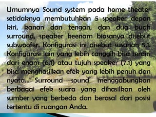 Dokumen tersebut memberikan panduan tentang penempatan speaker untuk home theater, termasuk speaker depan (tengah, kiri dan kanan), surround, dan subwoofer. Penempatan yang tepat diperlukan untuk menciptakan efek suara yang realistik dan menyelubungi.