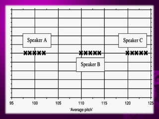 This document discusses forensic speaker identification. It begins by explaining that a person's voice contains a wealth of identifying information, including their age, health, education, and location. There are two main factors that make voices unique - organic/anatomical factors that are outside a speaker's control, and articulatory/style factors that a speaker can control. Forensic speaker identification aims to determine whether an unknown voice sample matches a known speaker. It relies on the theory that voices are uniquely identifiable through voiceprint analysis, similar to fingerprint analysis. The document outlines the tasks of speaker identification, which determines the source of an unknown voice among multiple candidates, and speaker verification, which accepts or rejects a claimed identity. It discusses sources of variability between