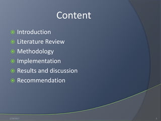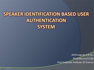 This document discusses speaker identification and authentication methods. It presents an overview of authentication approaches like tokens, knowledge, and biometrics. It then reviews literature on speech recognition paradigms and approaches. The methodology section proposes a speaker identification system that preprocesses voice files, extracts LPC features, and uses an artificial neural network for pattern matching. Results show the system achieves around 84% correct identification accuracy on 88 samples. Recommendations include interconnecting LPC and neural network modules, enabling text-independent identification, increasing the number of users and accuracy, and enabling cross-platform development.