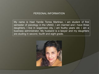 Hael Yamile Torres Martinez is a 40-year-old business administrator who lives in Sogamoso City, Colombia with her husband, who is a lawyer, and their three daughters aged 8-14. She lives with her family in a three bedroom, two bathroom apartment where they enjoy family pictures and her paintings. Her daily routine consists of waking up at 6am, showering, eating breakfast, commuting to work, having lunch, returning to work in the afternoon, arriving home at 8pm for dinner and doing university work before bed. On Sundays, she works in the afternoon and spends time with her family going to movies, eating ice cream, attending church and ordering food.