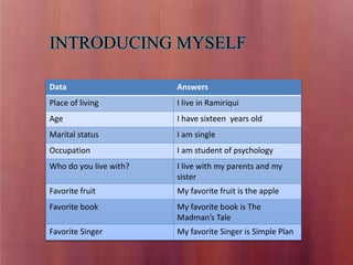 Yuly Andrea Boyacá González is a 16-year-old psychology student from Ramiriqui, Colombia who lives with her parents and sister. She introduces herself by stating her age, marital status, occupation, favorite fruit (apple), favorite book (The Madman's Tale), and favorite singer (Simple Plan). She describes her daily routine of taking a shower, having breakfast, going to work, lunching at 1pm, and returning to work at 2:30pm.