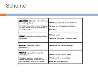 The document describes two pictures. The first picture shows a man cooking sausages on a gas barbecue on a sunny day in a park, while people sit at a picnic table. The second picture shows about 20 Japanese young people having a barbecue in a park, wearing jeans and dark shirts and making faces for the camera.