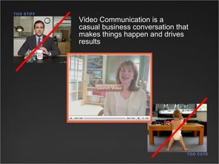 The document provides guidance for creating effective employee-generated video communication for business purposes. It discusses choosing the proper equipment like webcams or flip cams depending on the situation. Upgrading to higher quality equipment may be worth the $2,000 investment for more professional looking videos. The document also outlines when to hire a professional video crew and provides tips to avoid common mistakes like poor lighting, locations, or coming across too formally.