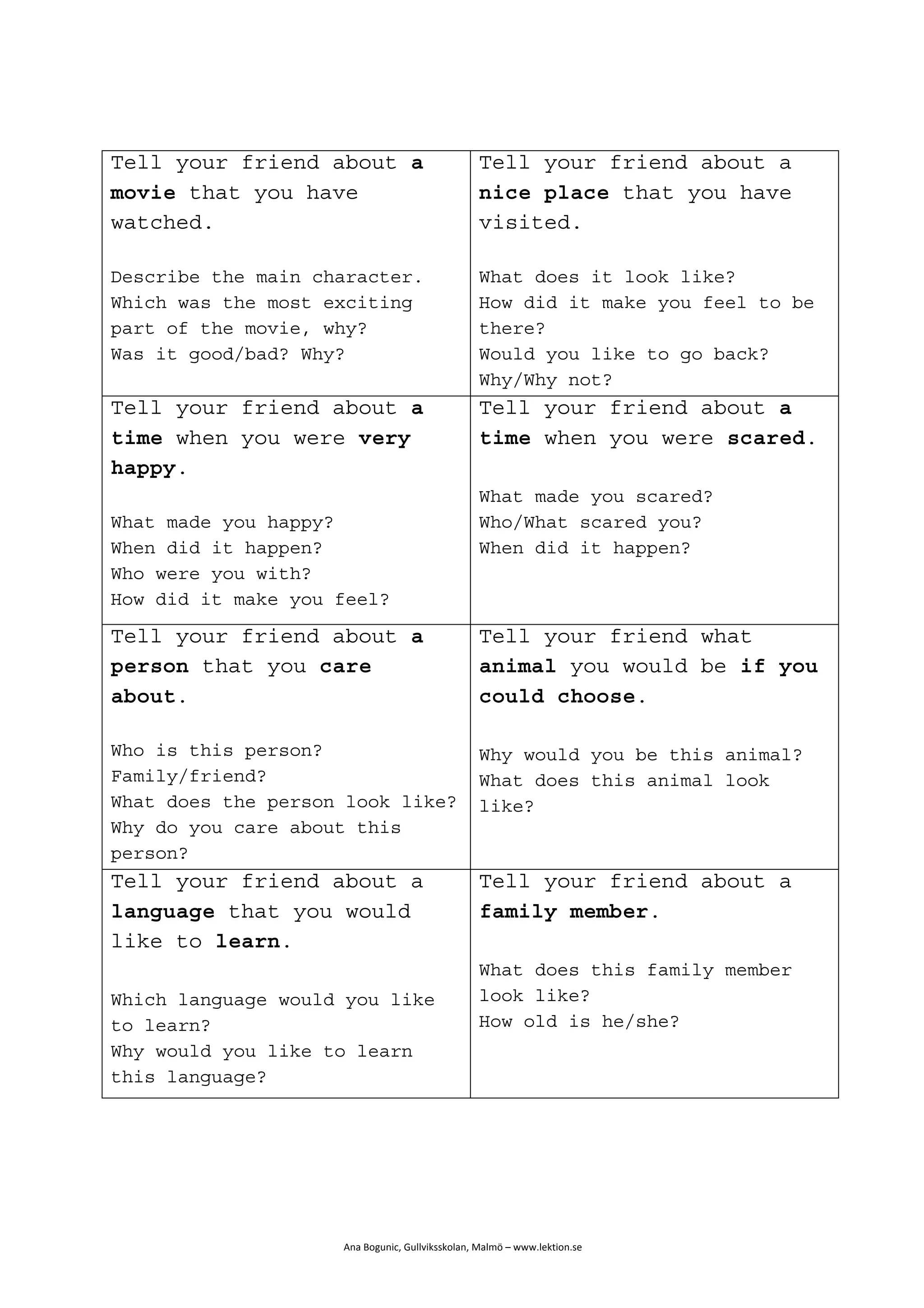 The document provides prompts for telling a friend about different topics such as a movie seen, a place visited, a happy or scary experience, a person cared about, an animal one would like to be, a language to learn, a family member, breakfast that morning, spare time activities, a fear, something learned in school that week, something wanted to change in the world, a country to travel to, a celebrity to meet, and what would be bought with 10,000 kr if won. The prompts include describing details about characters, settings, feelings, reasons, and more to share with a friend.