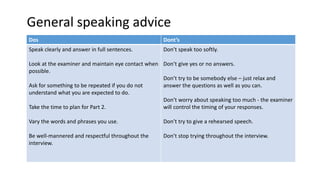 This document provides advice and information about the IELTS Speaking test. It describes the structure and scoring of the test, which consists of three parts: an introduction and interview, a long turn, and a two-way discussion. The document outlines what is required in each part and gives tips for improving fluency, vocabulary, grammar, and pronunciation. It emphasizes the importance of practice, such as recording mock interviews, to identify errors and enhance speaking skills.