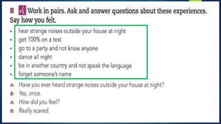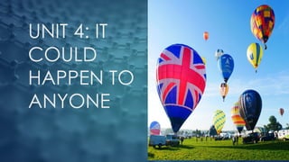 Unit 4 discusses personal experiences related to luck, happiness, and negative events. It includes prompts for conversations about past experiences, such as finding money or engaging in various activities. The unit also explores superstitions and the significance of fortune-telling and predictions.