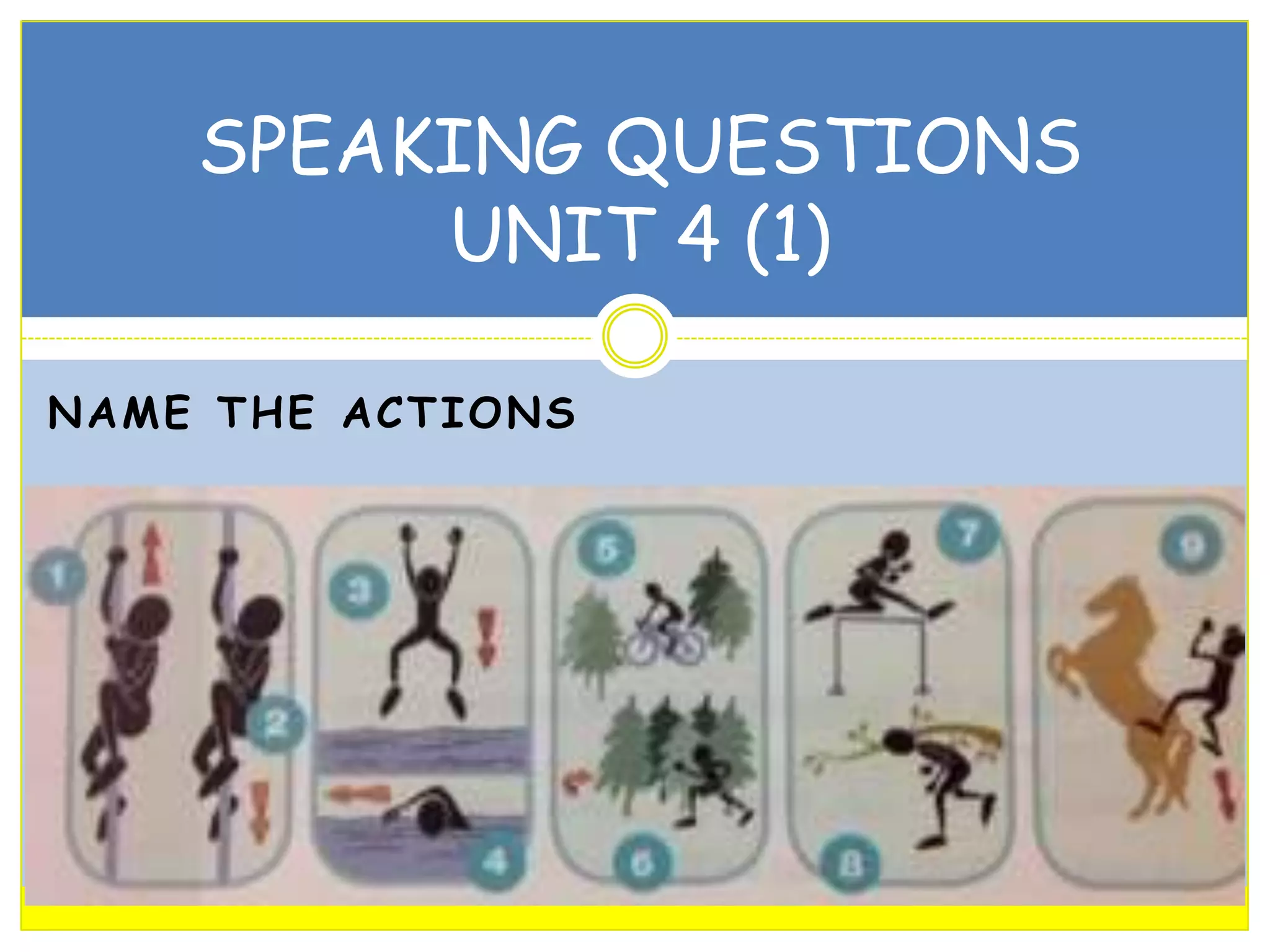 This document contains speaking questions and exercises for English language learners divided into three sections. The first section lists actions verbs like climb, jump, and walk. The second section provides questions about the weather and possible answers. The third section gives sentences in Spanish and their English translations dealing with activities people were doing in the past.