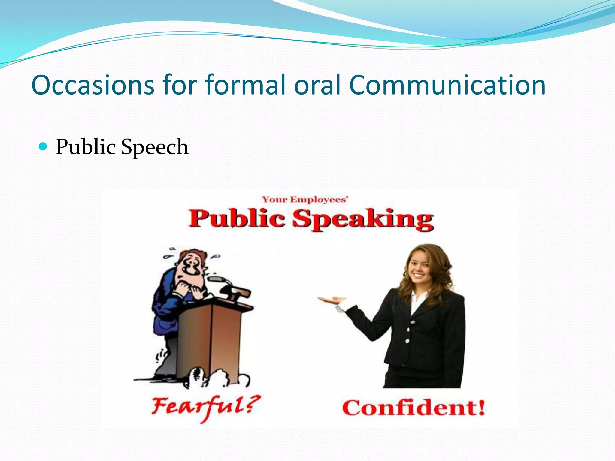 The document discusses various types of formal oral communication including public speeches, presentations, meetings, group discussions, and interviews. It provides tips for each type of communication as well as dos and don'ts. For public speeches, it suggests doing research, organizing ideas logically, and using techniques like eye contact. For meetings, it outlines the roles of chairperson, secretary, and participants. Group discussions allow people to share views and are beneficial for skills development. Proper preparation and positive qualities are keys for successful job interviews.
