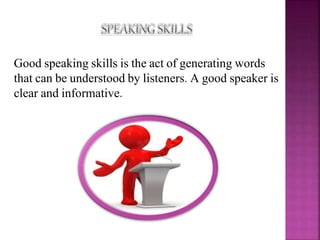 Good speaking skills involve generating clear, well-reasoned words that can be understood by listeners. There are three types of speeches that can enhance speaking skills: speeches that inform and explain information, speeches that persuade or influence beliefs, and speeches that entertain using humor. Developing strong speaking skills requires practice speaking in pairs, groups, and in different situations like interactive, partially interactive, and non-interactive settings. Careful planning and preparation is needed to maintain listeners' attention and deliver an effective speech without barriers to communication.