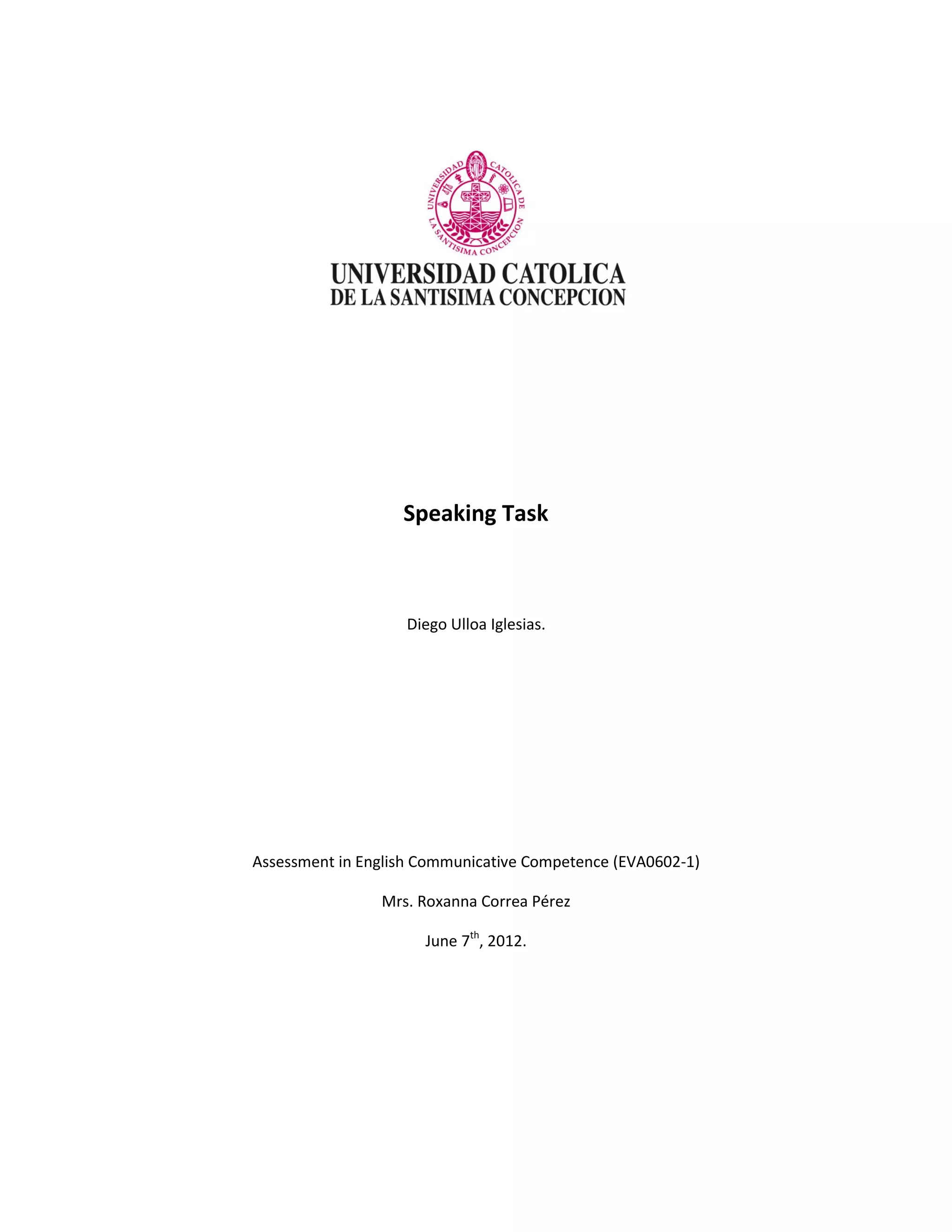 The document outlines an oral assessment task for two students to evaluate their English communicative competence. It includes details on the test specifications, two-part speaking task, rubrics, piloting of the task with students, and proposed improvements. The task requires students to first individually compare and contrast two job photos, then together discuss four photos and come to an agreement on the most dangerous job. Issues with vocabulary and fluency emerged during piloting, but students' performance was considered good given their experience and education. Improvements include showing all photos at once and acknowledging format limitations of public schools.