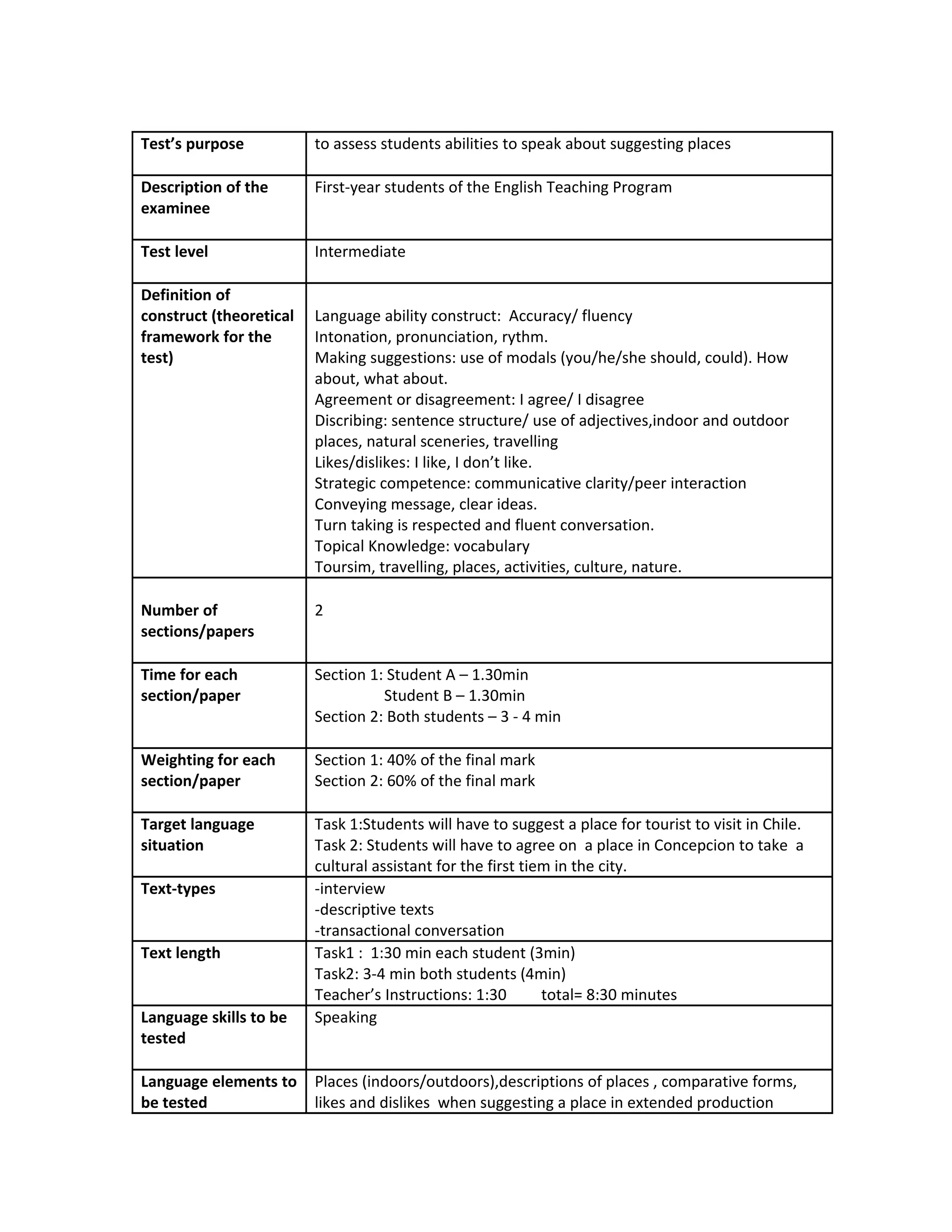 The document describes a speaking assessment for first-year English teaching students. The test contains two tasks: 1) Students choose a place to recommend to tourists and explain their choice in 1.5 minutes. 2) Students discuss potential cultural activities in Concepcion and agree on an option in 3-4 minutes. The test evaluates functions like suggesting, agreeing, and describing using adjectives. It assesses accuracy, fluency, vocabulary range and clarity of communication. Rubrics provide criteria for evaluating students' performance in each task.