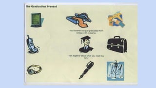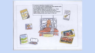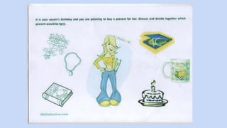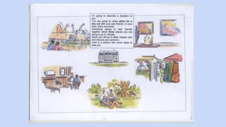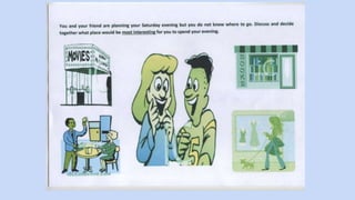 This document provides guidance and language for a speaking exam where the test taker must discuss a situation presented by the examiner. It includes examples of language for suggesting activities, responding to suggestions, discussing alternatives, asking for and giving opinions, agreeing and disagreeing, and expressing preferences. It reminds test takers to listen carefully, use the pictures as ideas but not descriptions, think about whether the situation involves themselves or a third party, start discussing immediately without background, give reasons for opinions, and allow equal participation without dominating.