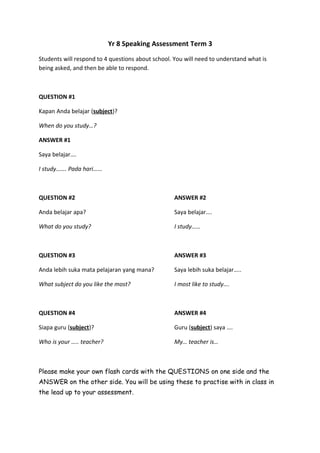 Students will be assessed on their speaking skills by responding to 4 questions about school subjects in Indonesian. They are to create flashcards with the questions on one side and answers on the other to practice for their assessment. The questions will ask when they study a subject, what they study, their favorite subject, and who their teacher is for a particular subject.