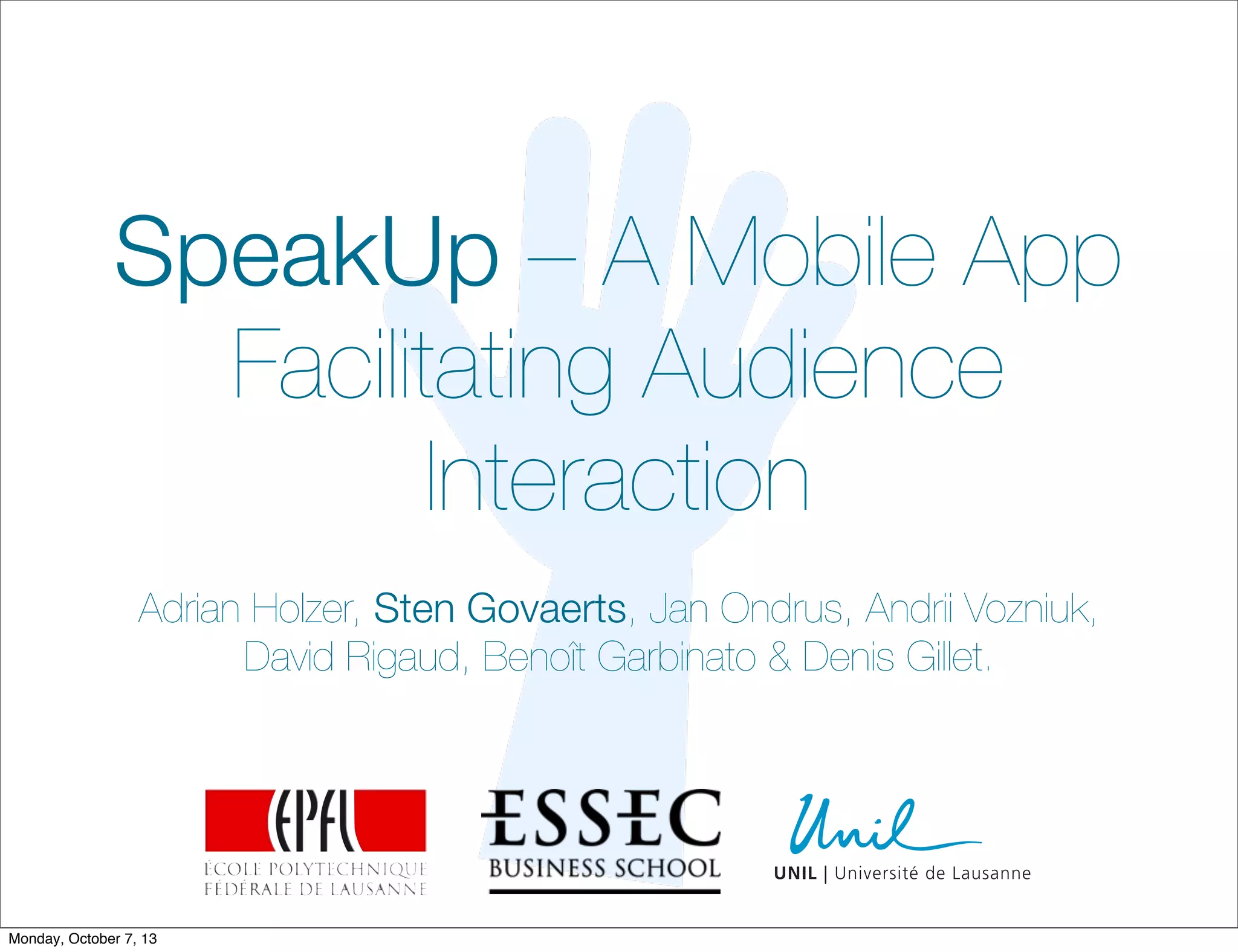 The document presents 'Speakup', a mobile app designed to enhance audience interaction by facilitating anonymous messaging during lectures. It promotes active participation and provides a platform for students to ask questions without the fear of ridicule. The results of a survey indicate that users find value in the app for improving class interactions and easing participation.