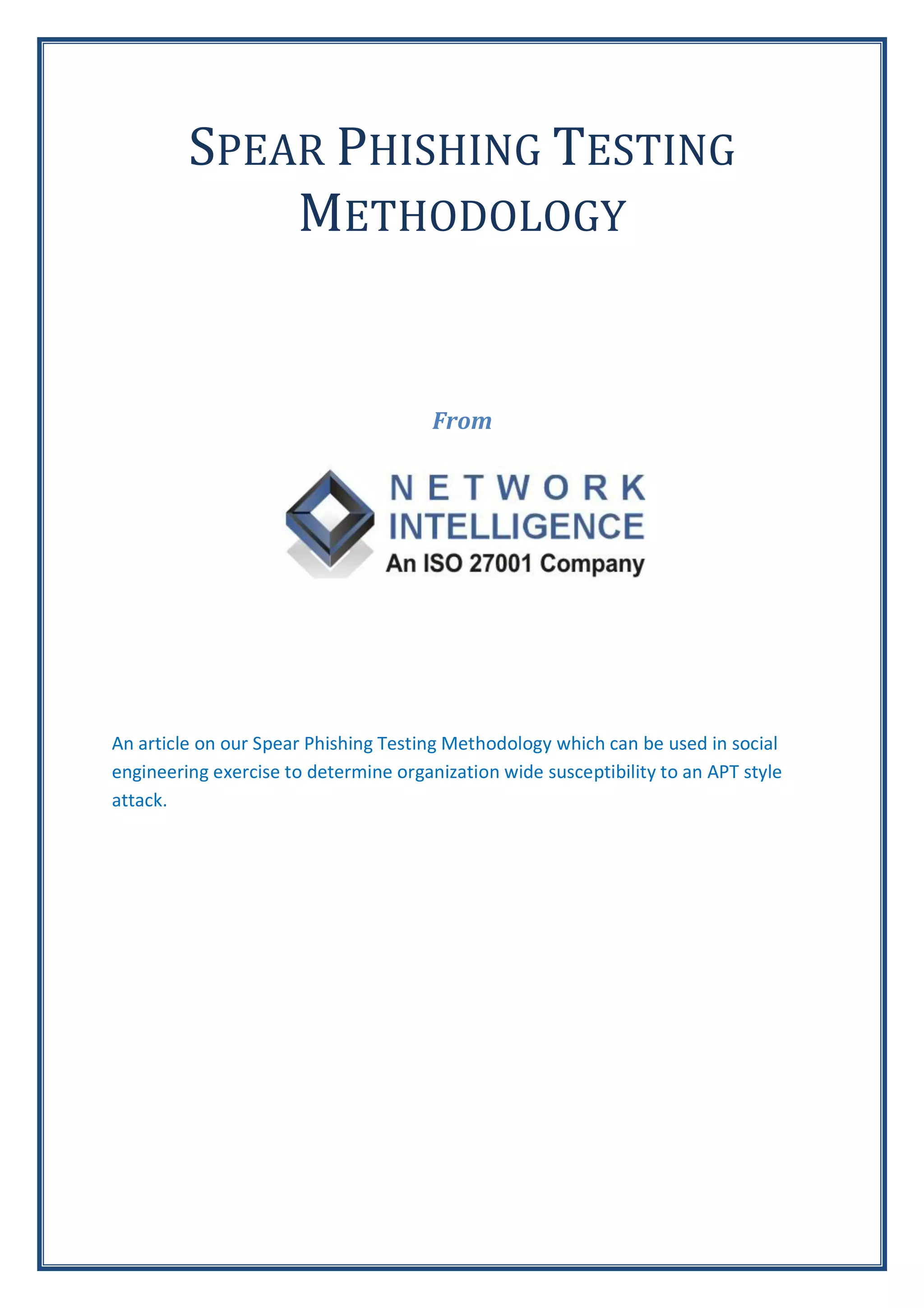 The document outlines a methodology for spear phishing testing, aimed at assessing an organization's vulnerability to social engineering attacks. It details the nuances of spear phishing, emphasizing the importance of impersonating authoritative figures and manipulating trust to extract confidential information. The methodology includes stages such as identifying targets, establishing trust, stressing urgency, and employing innovative techniques to gather sensitive data.