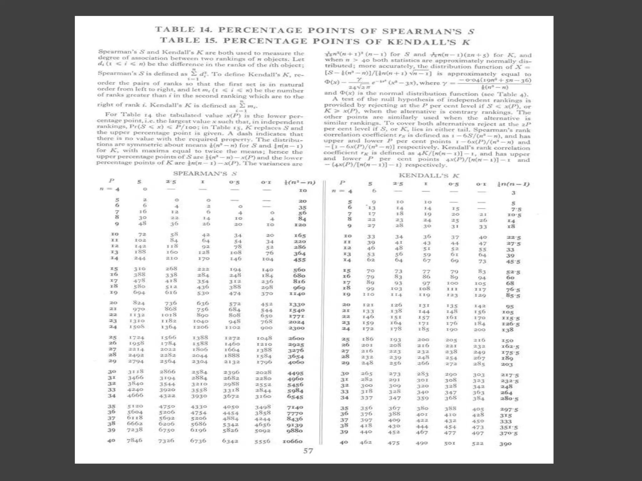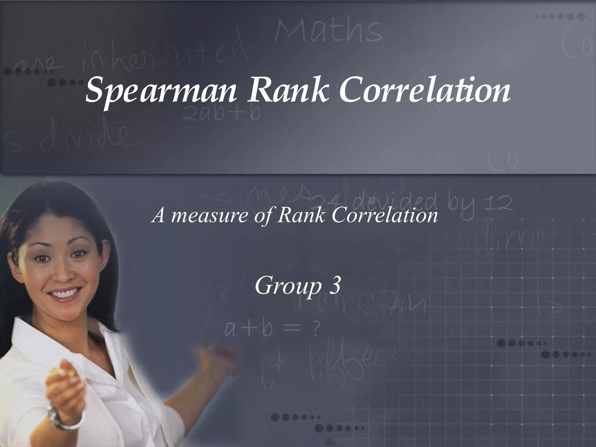 The document discusses Spearman's rank correlation coefficient, a nonparametric measure of statistical dependence between two variables. It assumes values between -1 and 1, with -1 indicating a perfect negative correlation and 1 a perfect positive correlation. The steps involve converting values to ranks, calculating the differences between ranks, and determining if there is a statistically significant correlation based on the test statistic and critical values. An example calculates Spearman's rho using rankings of cricket teams in test and one day international matches.