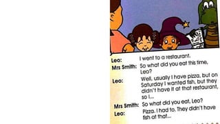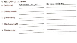 The document lists different places someone could go, things they could see or do at each place, and foods and drinks they could have. It then provides examples of questions and answers about these activities using pronouns like he, she and they.