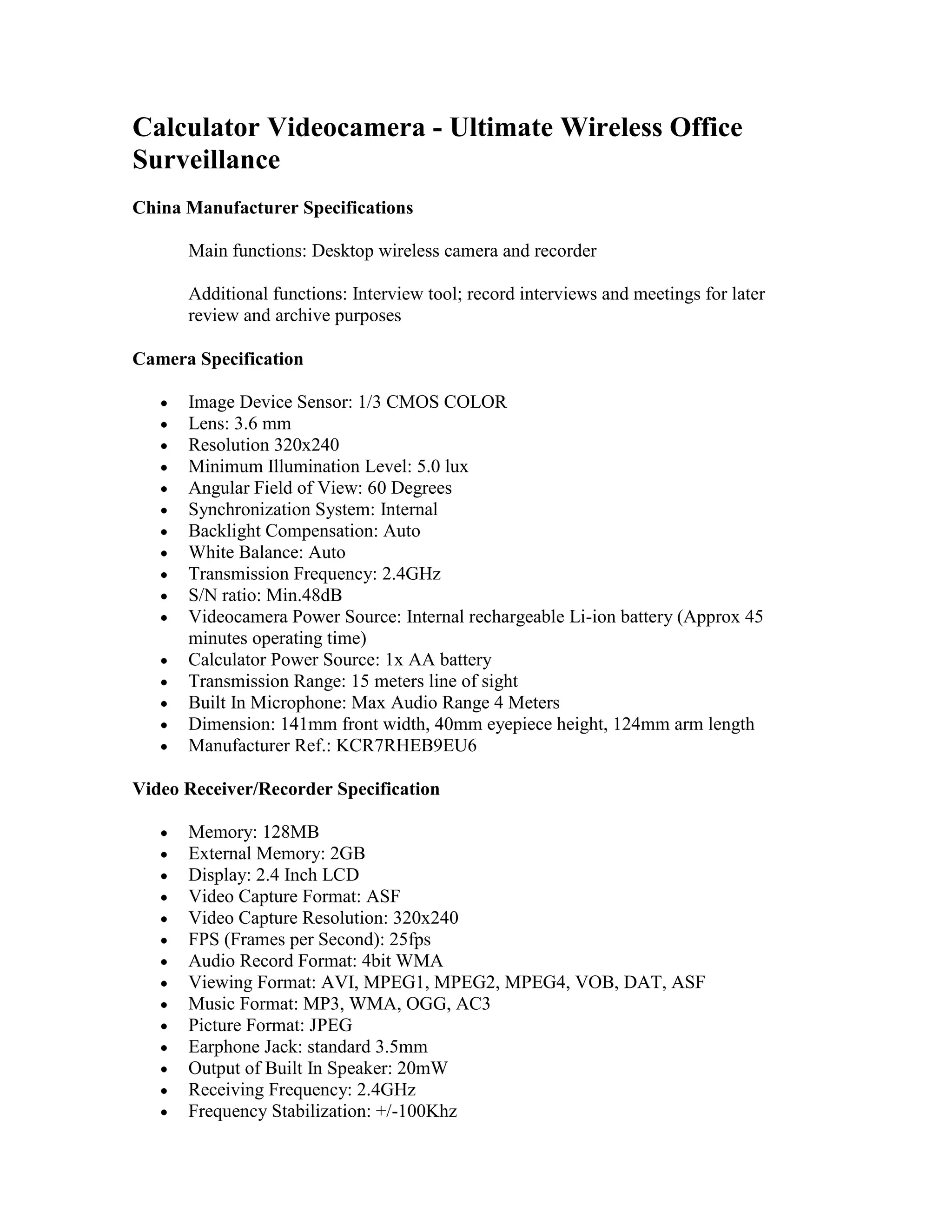 2. The calculator camera has a 320x240 resolution CMOS sensor, 3.6mm lens, records to the receiver in AVI format at 25 fps, and operates for 45 minutes on a rechargeable battery.
