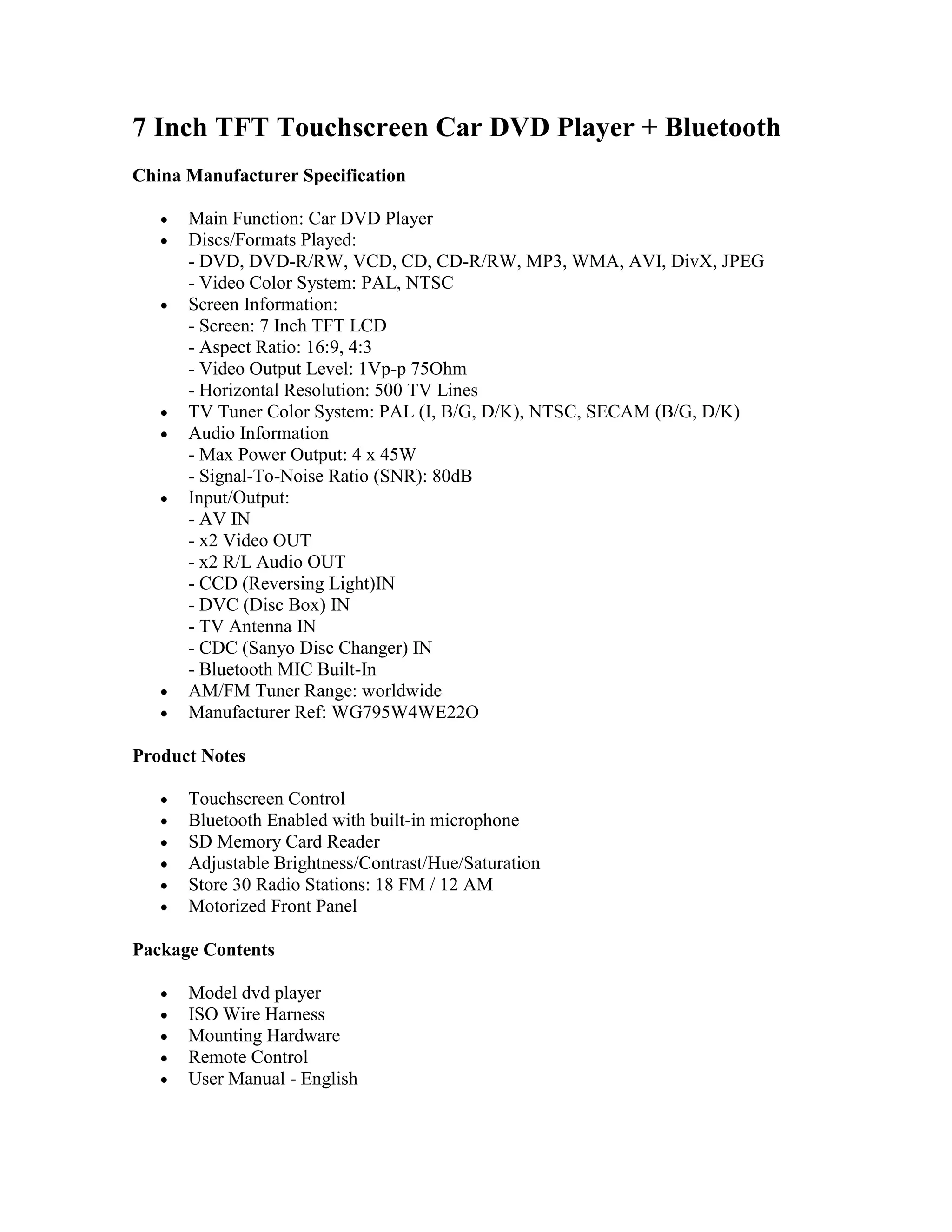 This document summarizes the specifications of a 7-inch car DVD player with Bluetooth connectivity. It has a 7-inch touchscreen that supports DVD, CD, MP3, and other formats. It can play videos in PAL, NTSC, and SECAM formats. It has Bluetooth with a built-in microphone and supports SD cards. Additional features include 30 preset radio stations, RCA audio/video outputs, and it comes with a wiring harness and remote control.