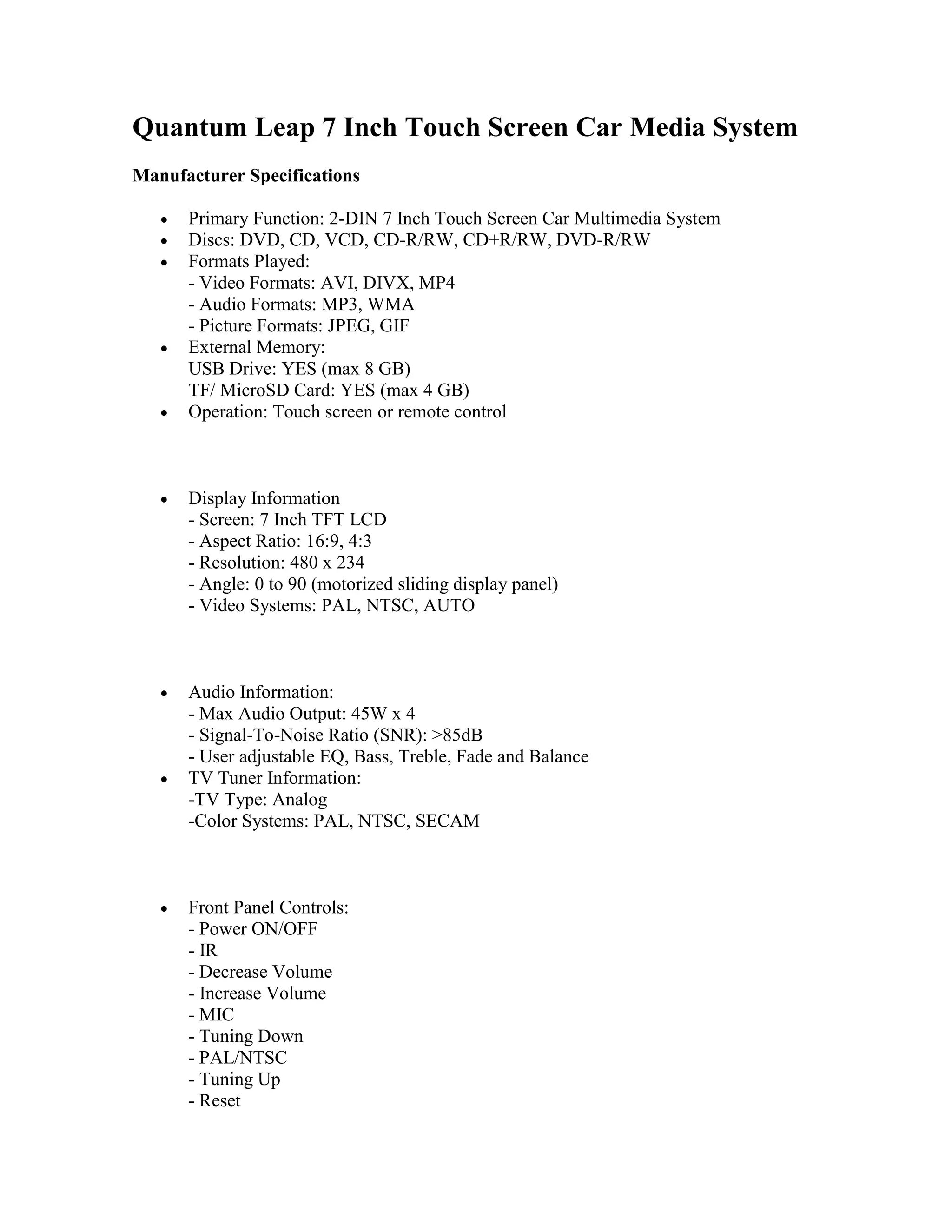This document provides specifications for a 7-inch touch screen car media system. It includes details on supported file formats, display specs, audio and video outputs, Bluetooth and radio functions, and dimensions. Connectivity options include USB, SD card, DVD/CD, and auxiliary inputs. The system can play media from USB drives, SD cards, CDs, DVDs, and supports connecting an iPod for music playback through the car stereo.