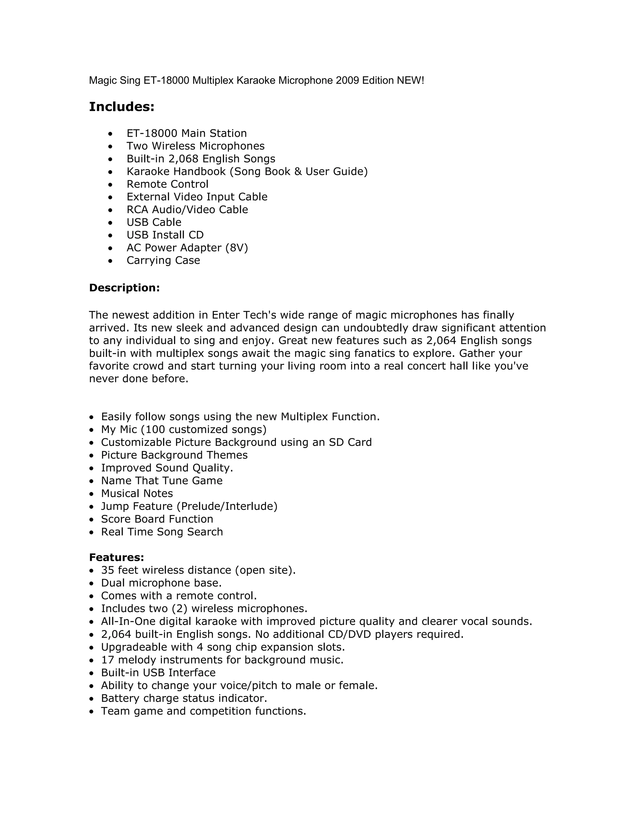 The Magic Sing ET-18000 is a new karaoke microphone system that includes two wireless microphones, a main station, and accessories. It has over 2,000 built-in English songs and allows multiple singers to use it simultaneously. The system provides various singing functions and games to make karaoke parties fun. It can also connect to external video sources and has improved sound quality compared to previous models.