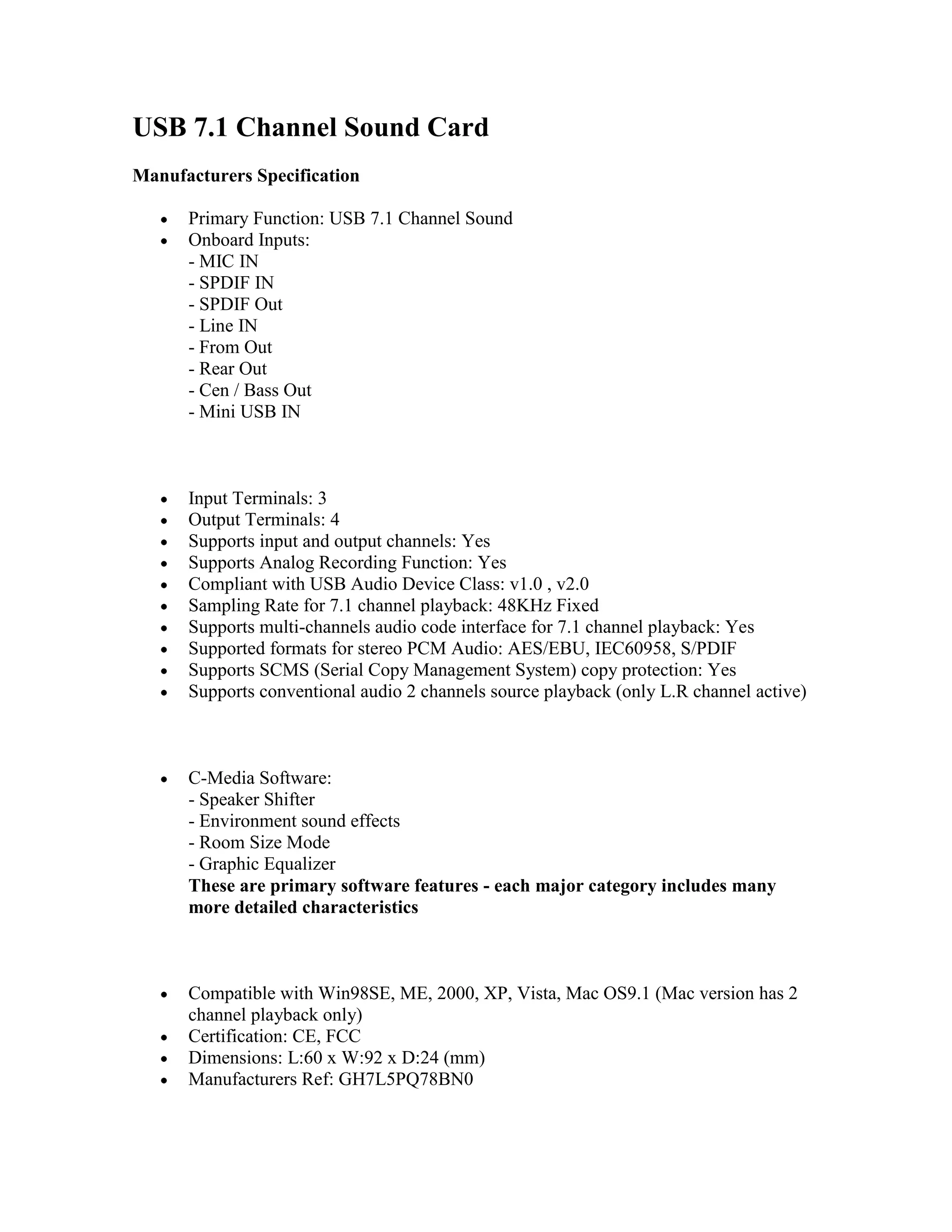 This document provides specifications for a USB 7.1 channel sound card, including supported inputs, outputs, sampling rates, and formats. Key features include support for 7.1 channel playback at 48kHz, analog recording, USB audio device class v1.0 and v2.0, and software for effects and equalization. Compatibility is listed as Windows 98SE through Vista and Mac OS 9.1.