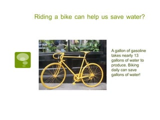 Riding a bike instead of driving can help save water, energy, and the environment while providing personal health benefits. It takes nearly 13 gallons of water to produce a gallon of gasoline, but biking saves those gallons. If just 5% of commuters in New York biked instead of driving, it could reduce carbon dioxide emissions equivalent to planting a forest the size of Manhattan. Biking to work for 30-60 minutes daily is also associated with lower blood pressure and stress.