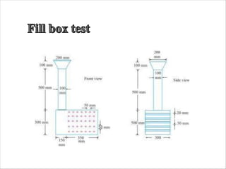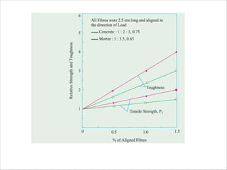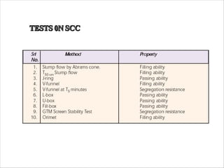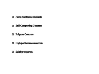 Fibre reinforced concrete is a composite material consisting of cement, mortar or concrete and discrete, uniformly dispersed fibres that can improve the flexural, impact and fatigue strength of concrete. Common fibres used include steel, polypropylene, nylon, glass and carbon fibres. The fibre geometry, content, orientation and distribution affect the composite material properties. Self-compacting concrete is a highly flowable mixture that does not require vibration for placing and consolidation due to its high deformability and low yield value. It provides benefits over conventional concrete such as faster construction, better surface finish and reduced noise levels. The mix design of SCC focuses on optimizing the powder content, chemical admixtures and viscosity.