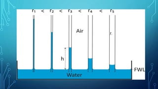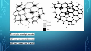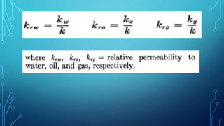 This document discusses special core analysis techniques used to measure relative permeability in rock samples. Special core analysis involves flow experiments on core samples to determine two-phase flow properties and relative permeability. The document describes methods to measure relative permeability, including maintaining intimate contact between core samples during steady fluid flow. It also discusses factors that influence relative permeability measurements like wettability alterations and saturation history effects during gas and water displacement processes. Capillary pressure tests and different capillary pressure measurement methods are also summarized.