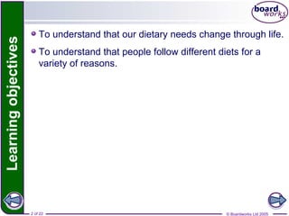 This document discusses different types of special diets that people follow. It explains that dietary needs change throughout life and differ between individuals. Some common reasons for special diets are religious beliefs, food allergies or intolerances like celiac disease, and athletic training. The document provides details on vegetarian, vegan, and gluten-free diets. It emphasizes the importance of obtaining proper nutrition from alternative food sources when entire food groups are excluded.