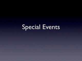 The document discusses jQuery special events, which allow modifying existing events or creating new custom events. Special events have setup and teardown functions that run on event binding and unbinding. Examples shown create tripleclick and multiclick events by tracking click counts, and override the click event setup to set the cursor style. Special events can also modify event handler functions and data during binding using the add hook introduced in jQuery 1.4.2.