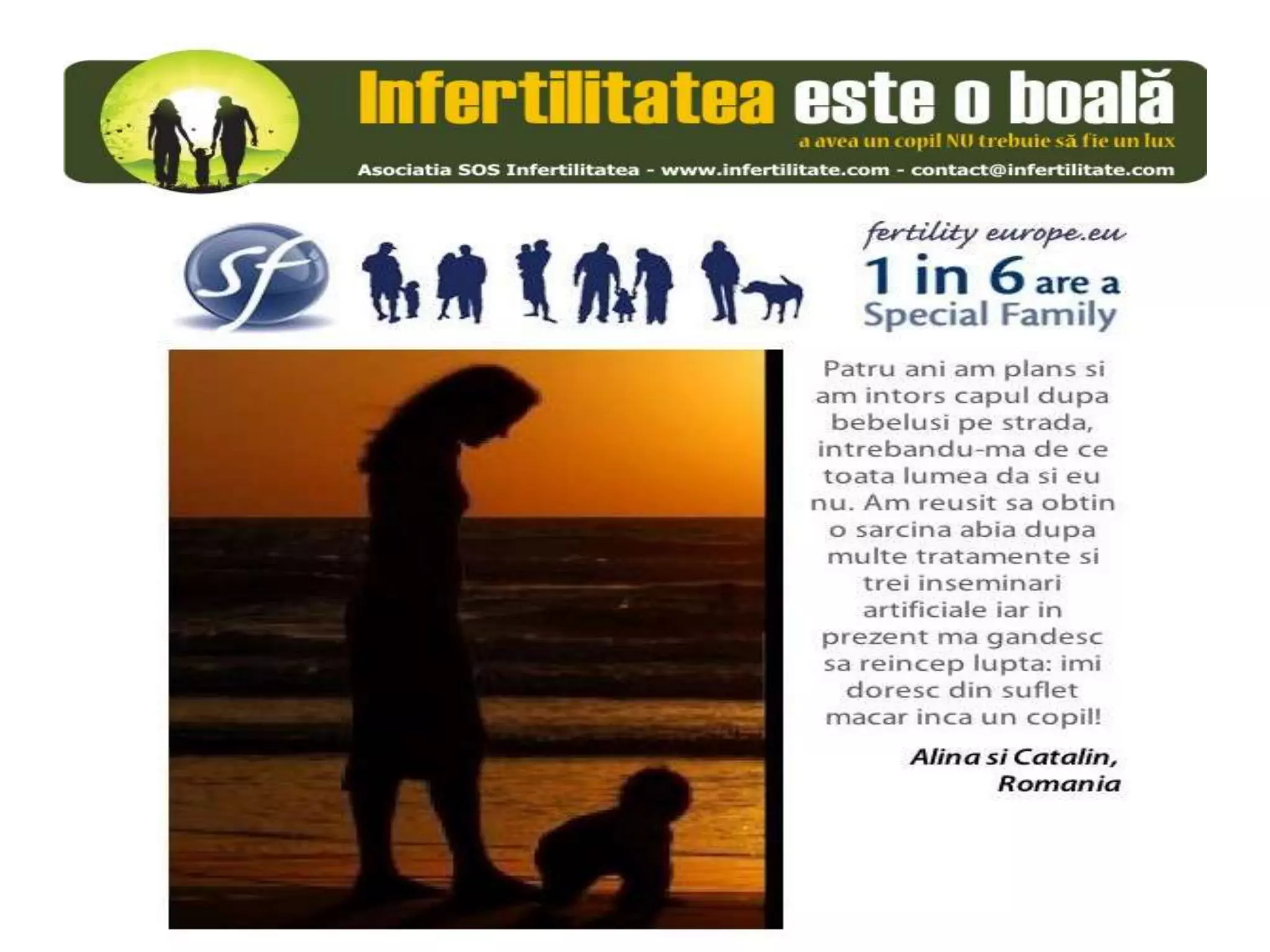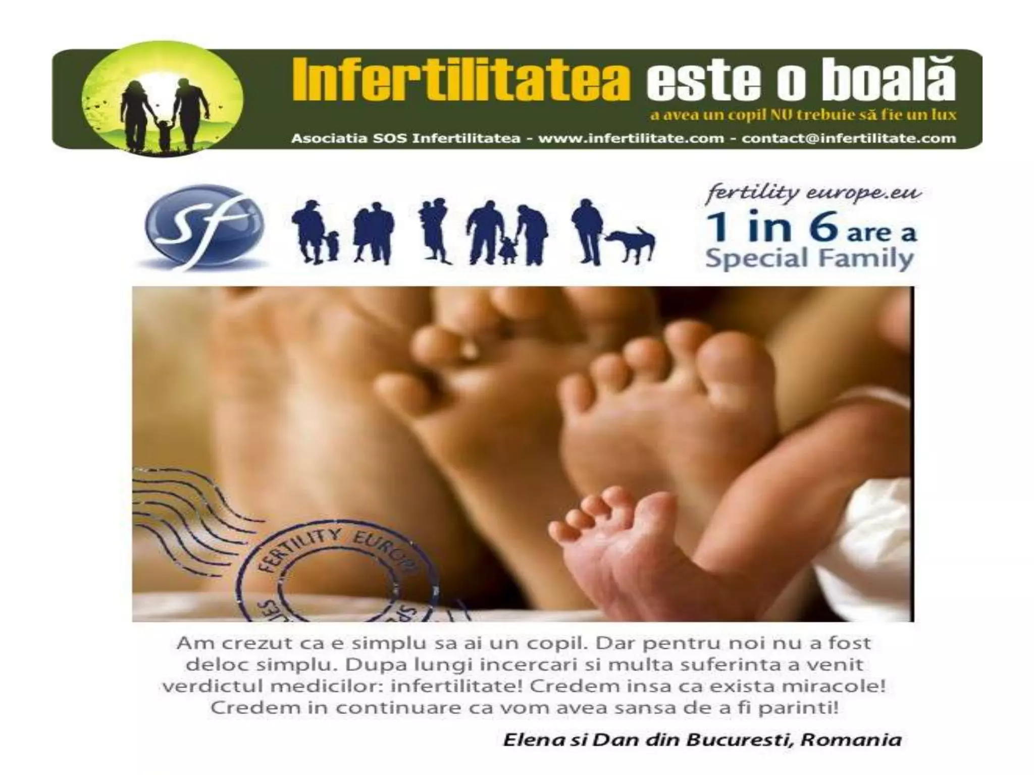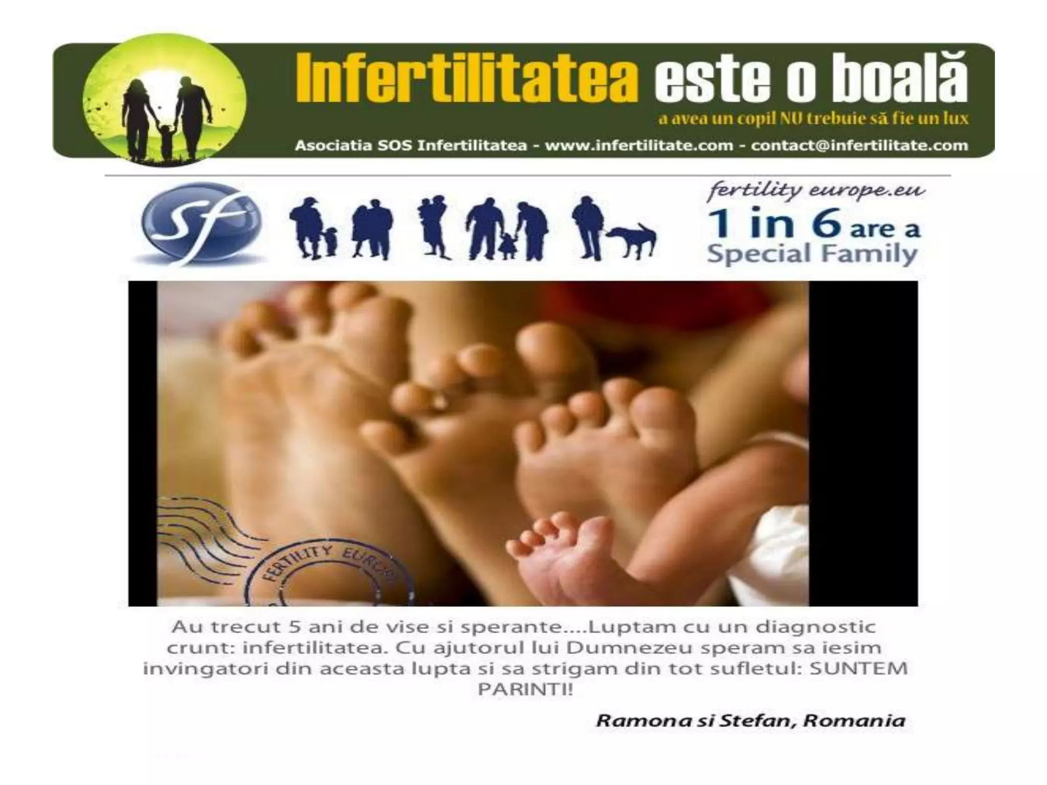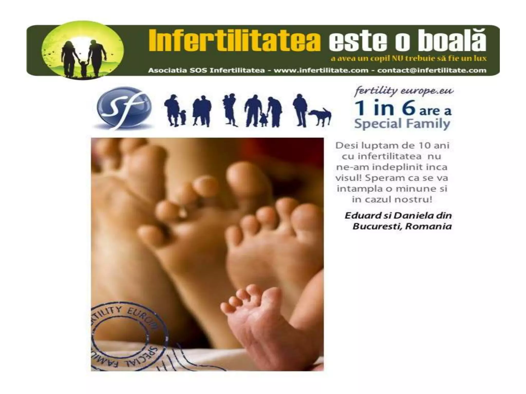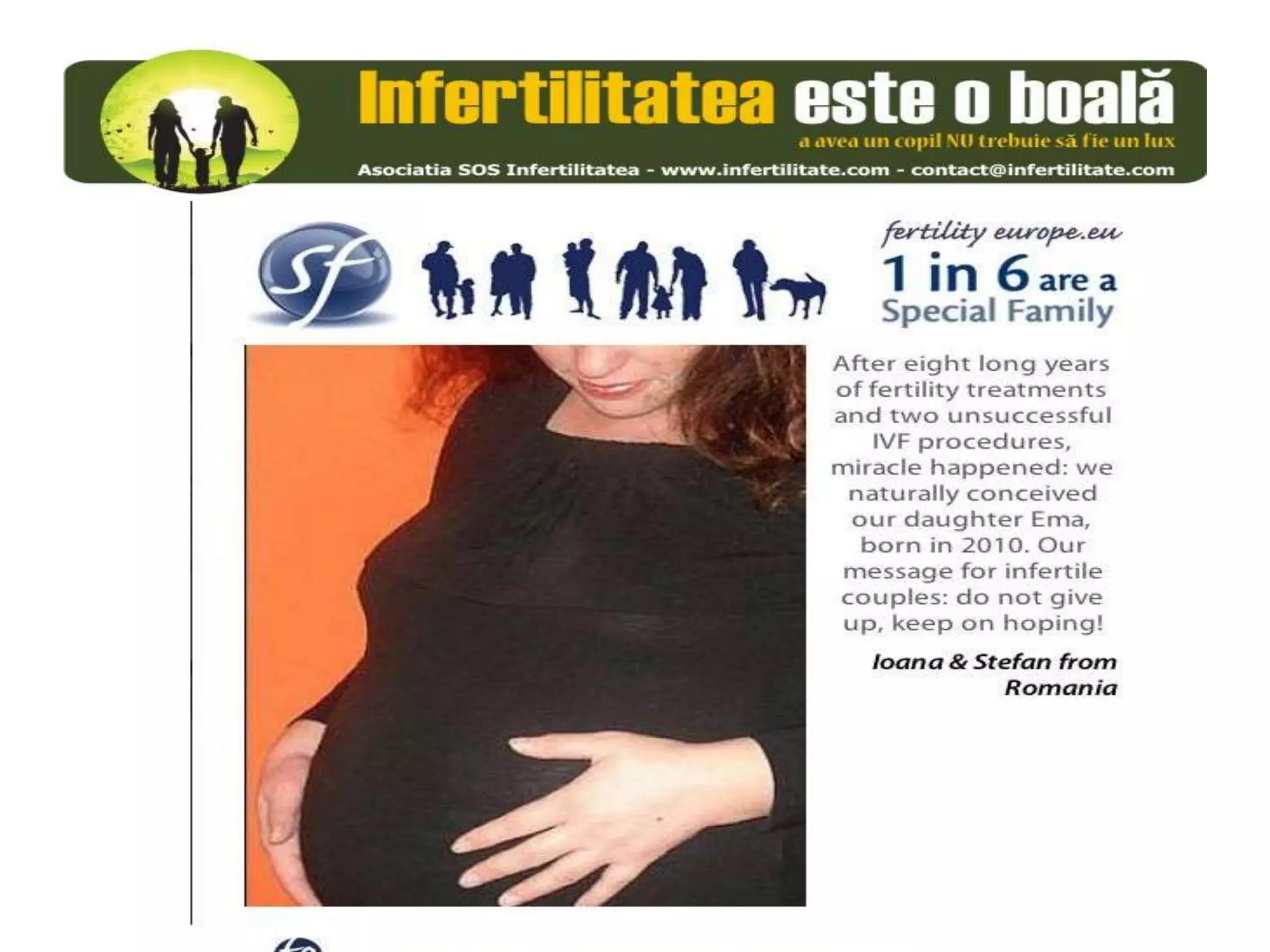 Unul din șase cupluri din Europa se confruntă cu probleme de fertilitate, afectând aproximativ 10 milioane de persoane care au nevoie de sprijin. Asociația SOS Infertilitate participă la o campanie paneuropeană subliniind impactul infertilității și desfășoară acțiuni de advocacy pentru conștientizarea acestei probleme. Organizația funcționează din donații și sponsorizări, fără angajați plătiți, și are ca obiectiv responsabilizarea clasei politice românești.