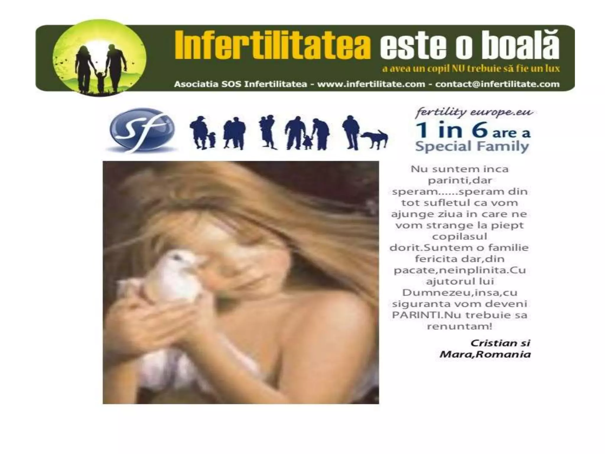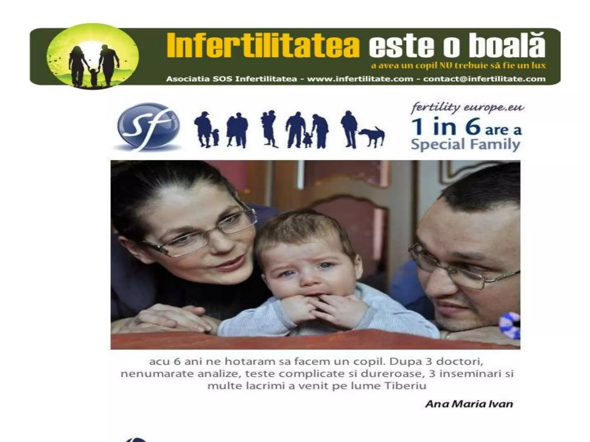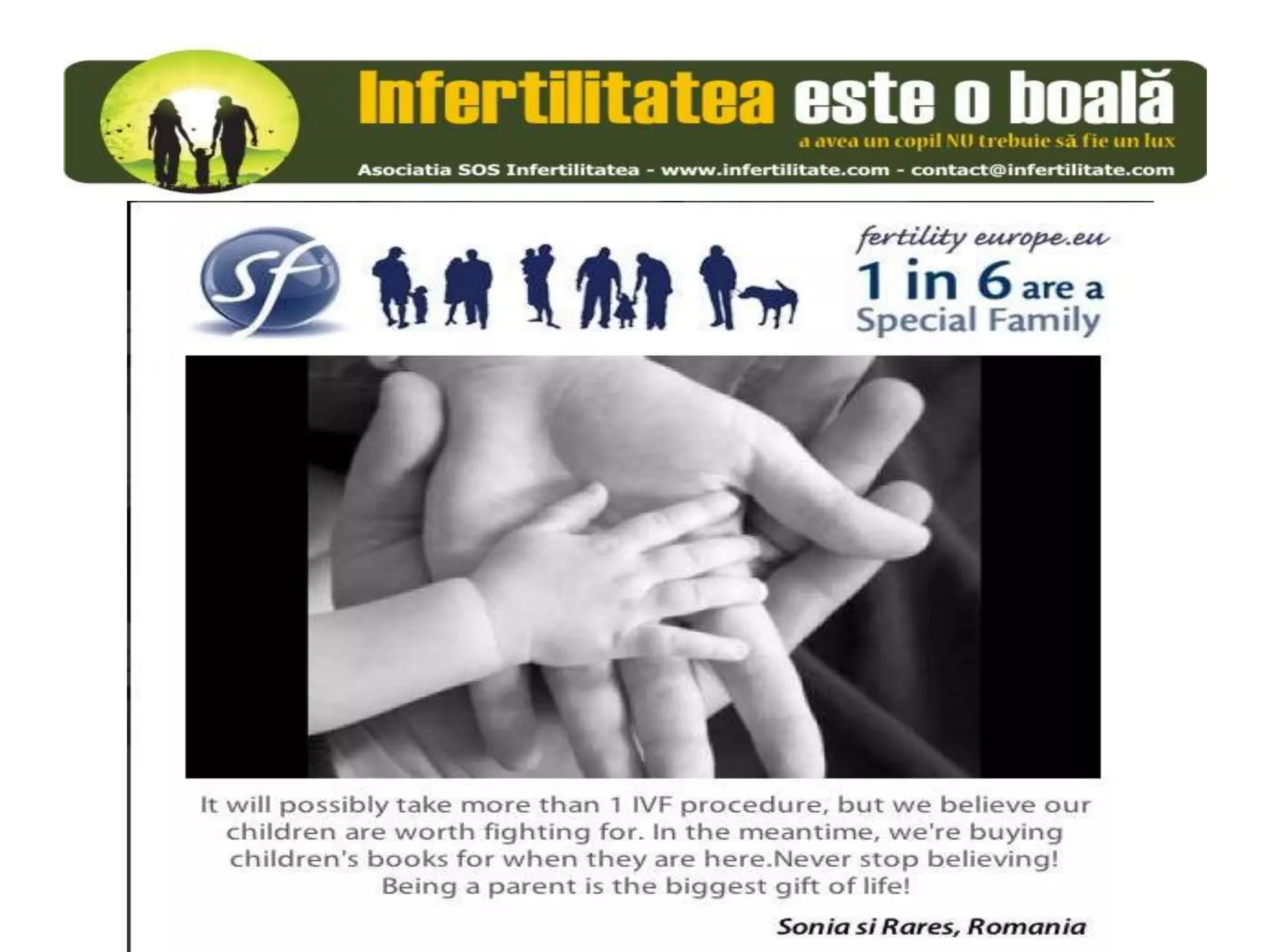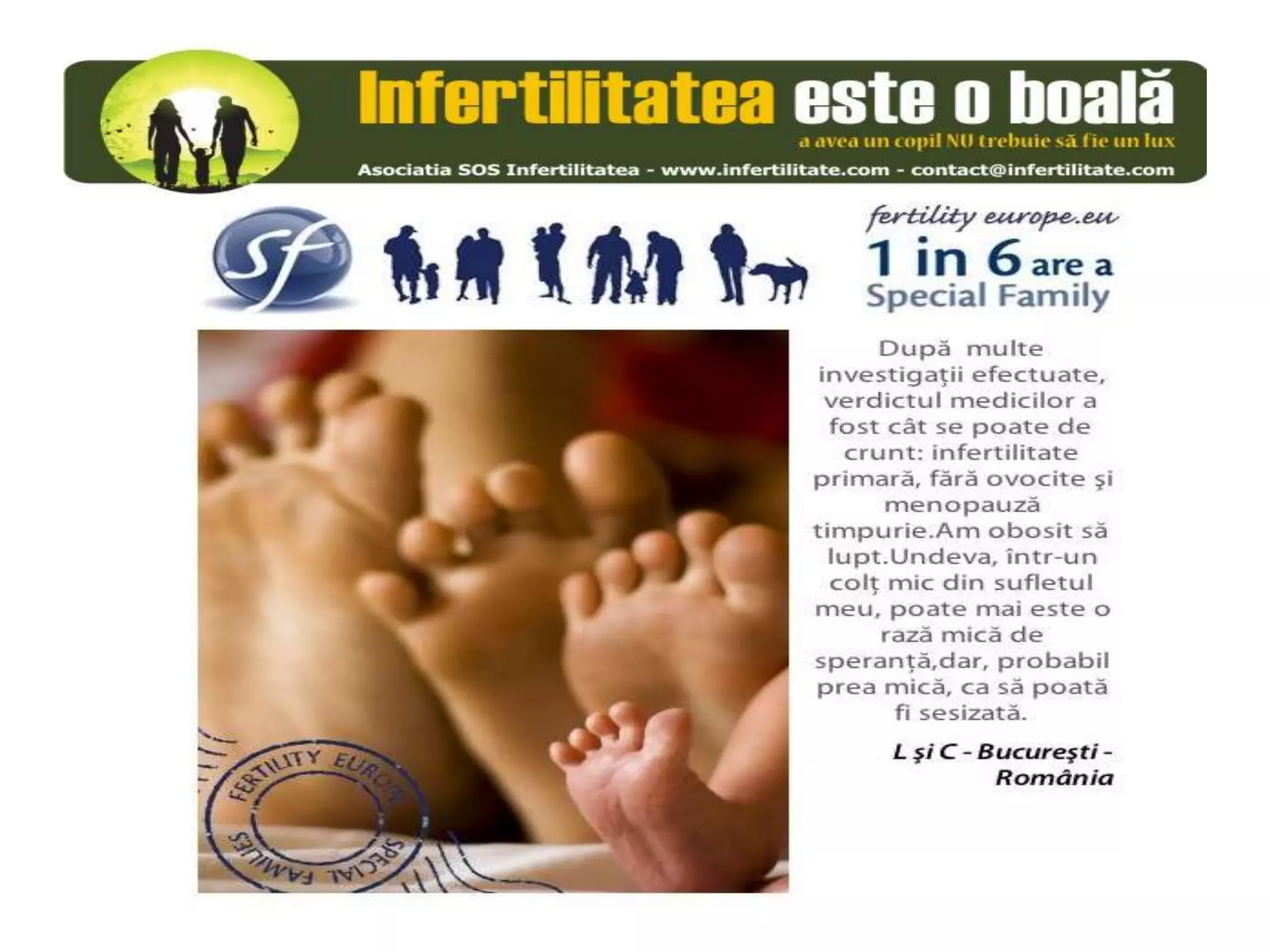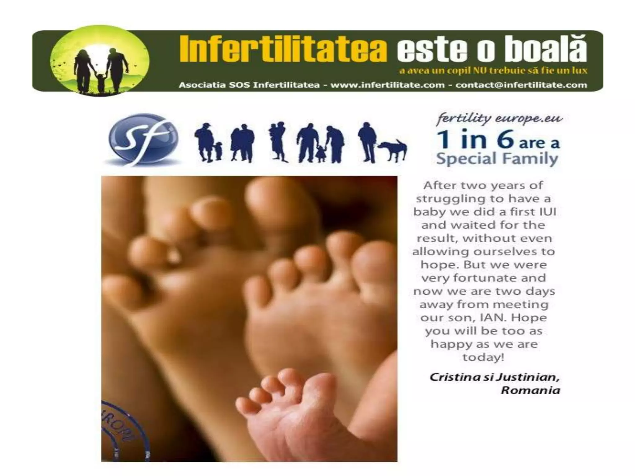 Unul din șase cupluri din Europa se confruntă cu probleme de fertilitate, afectând aproximativ 10 milioane de persoane care au nevoie de sprijin. Asociația SOS Infertilitate participă la o campanie paneuropeană subliniind impactul infertilității și desfășoară acțiuni de advocacy pentru conștientizarea acestei probleme. Organizația funcționează din donații și sponsorizări, fără angajați plătiți, și are ca obiectiv responsabilizarea clasei politice românești.